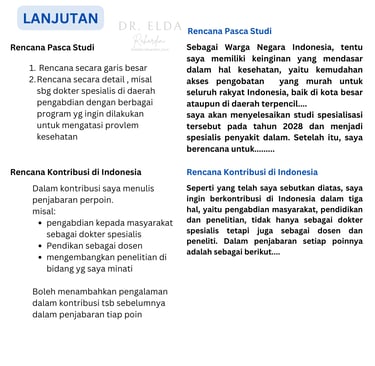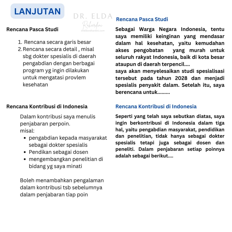 Rencana secara detail , misal sbg dokter spesialis di daerah pengabdian dengan berbagai program yg ingin dilakukan untuk mengatasi provlem kesehatan